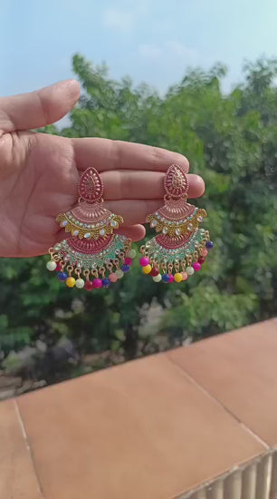 Add a splash of color and tradition to your festive look with these stunning multicolor Meenakari Chandbali earrings. Beautifully handcrafted with intricate enamel detailing, these earrings combine shades of pink, turquoise, and gold with vibrant multicolor beads that create a joyful and elegant statement.