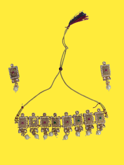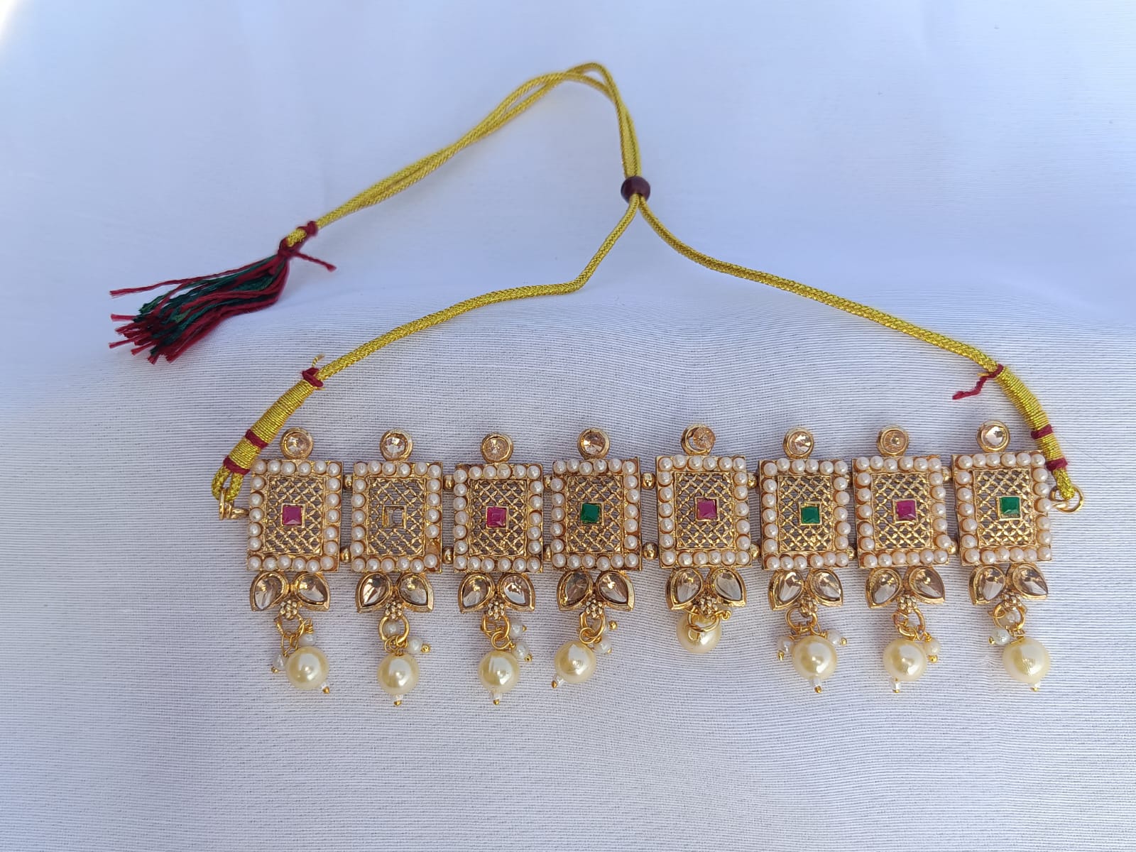 Rectangular designed Gold plated pearl and stone choker set - M25